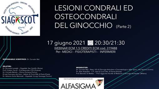 17giu20:3021:3030 minuti con… il comitato artroscopia - parte 2 (Webinar on-line) - ECM ?Lesioni condrali ed ostrocondrali del ginocchio, parte 2 - Si ringrazia AlfaSigma